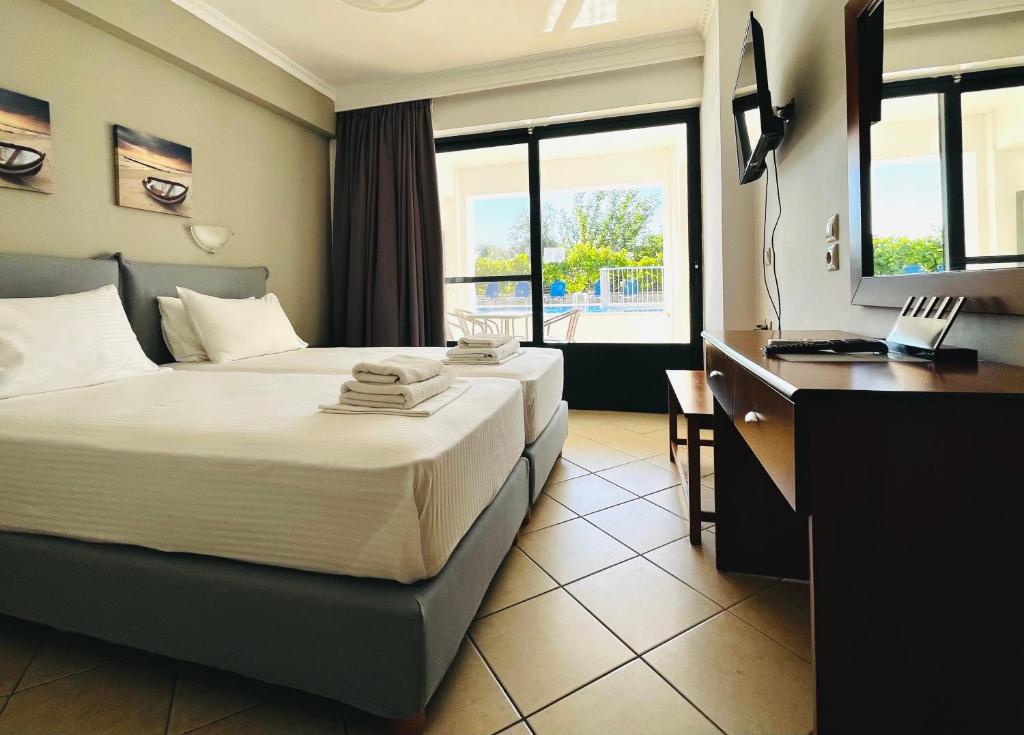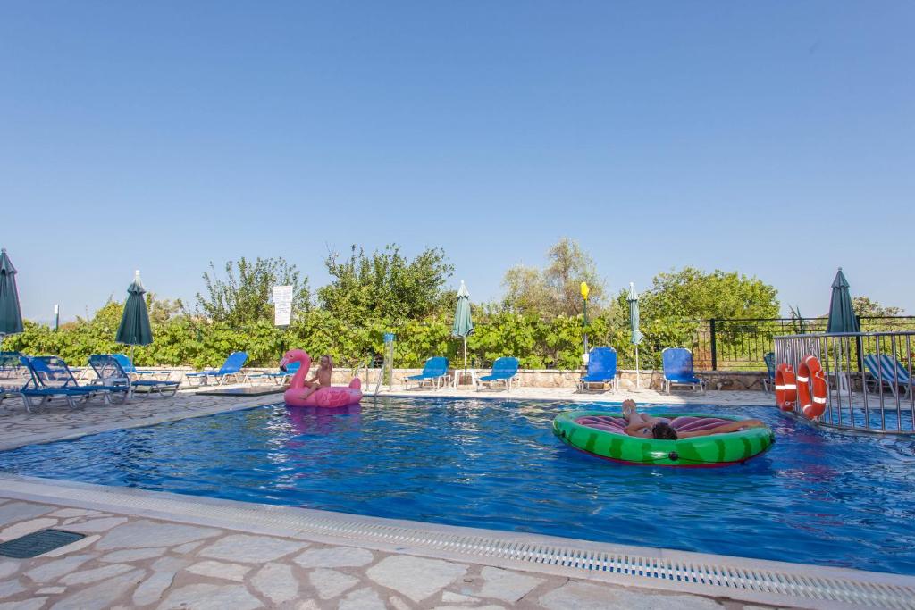 The complex features a swimming pool as well as a separate children’s pool, making it a great choice for families. Guests can enjoy fully equipped apartments with kitchen facilities, allowing for easy meal preparation during their stay. Each apartment includes air conditioning, a living room with dining area, satellite TV, refrigerator, and a furnished balcony overlooking the mountains or the pool.